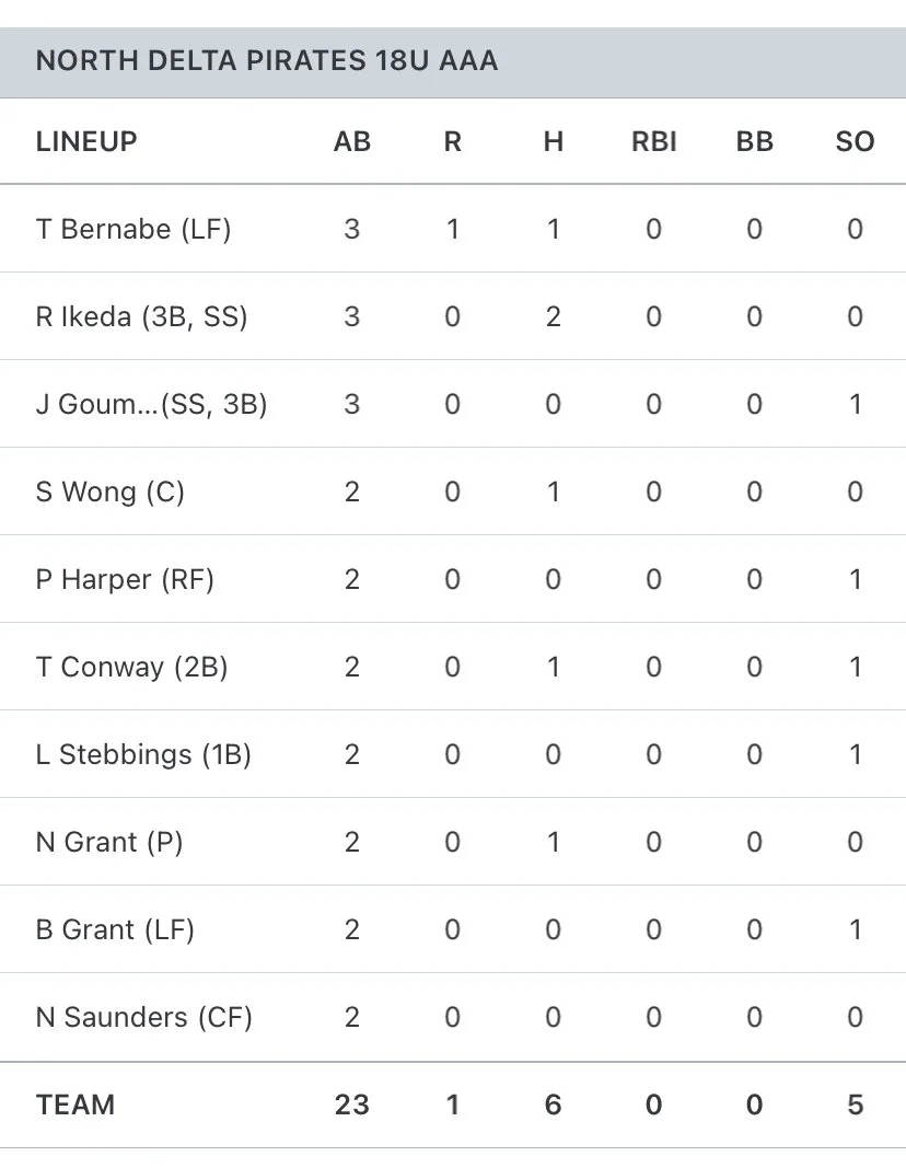 Bernabe, Sammy Wong, N. Grant, and Tyler Conway picked up the other hits for the North Delta Pirates.