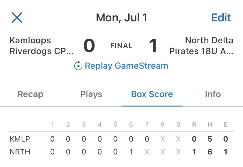 North Delta Pirates Defeat Kamloops RiverDogs College Prep in Pitching Duel; Move on to Final Against Cloverdale Rangers College Prep at Noon, Monday